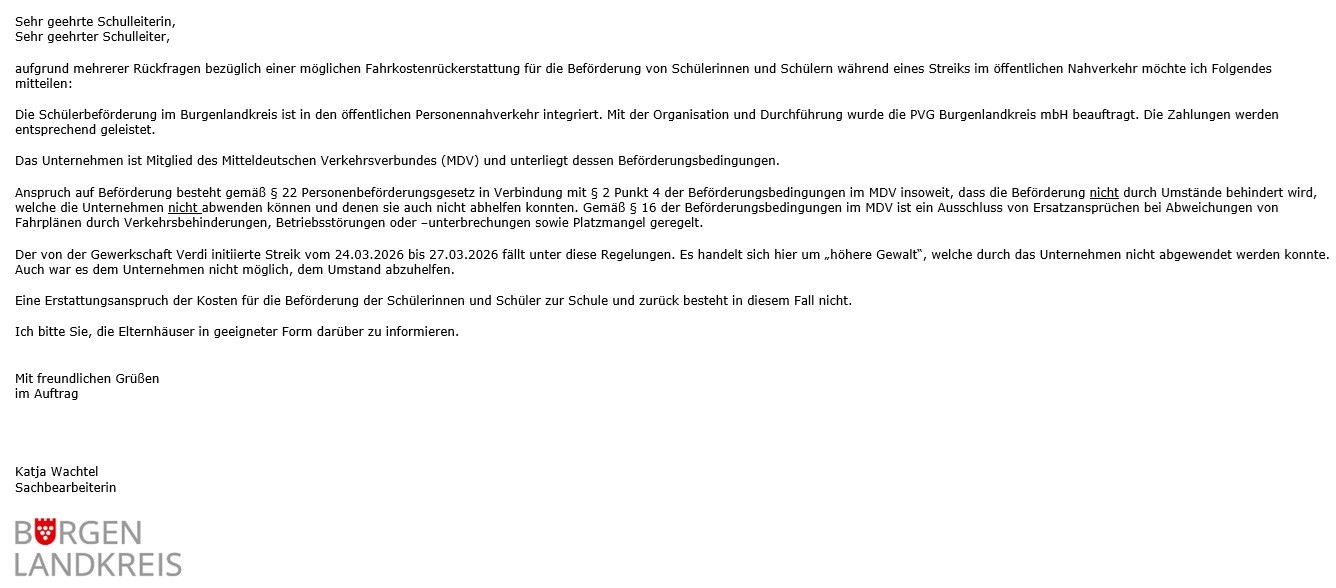 Sehr geehrte Schulleiterinnen und Schulleiter,die Gewerkschaft ver.di hat für den 19.03.2026 bis 22.03.2026 zu einem Warnstreik im öffentlichen Nahverkehr aufgerufen. Die Schülerbeförderung im Burgenlandkreis ist mit betroffen.Ich bitte Sie, die Elternhäuser dahingehend zu informieren, dass der Omnibusverkehr der PVG Burgenlandkreis mbH am Donnerstag und Freitag weitestgehend eingestellt wird. Die Eltern werden angehalten, alternative Lösungen zu suchen.Mit freundlichen Grüßenim AuftragKatja WachtelSachbearbeiterin